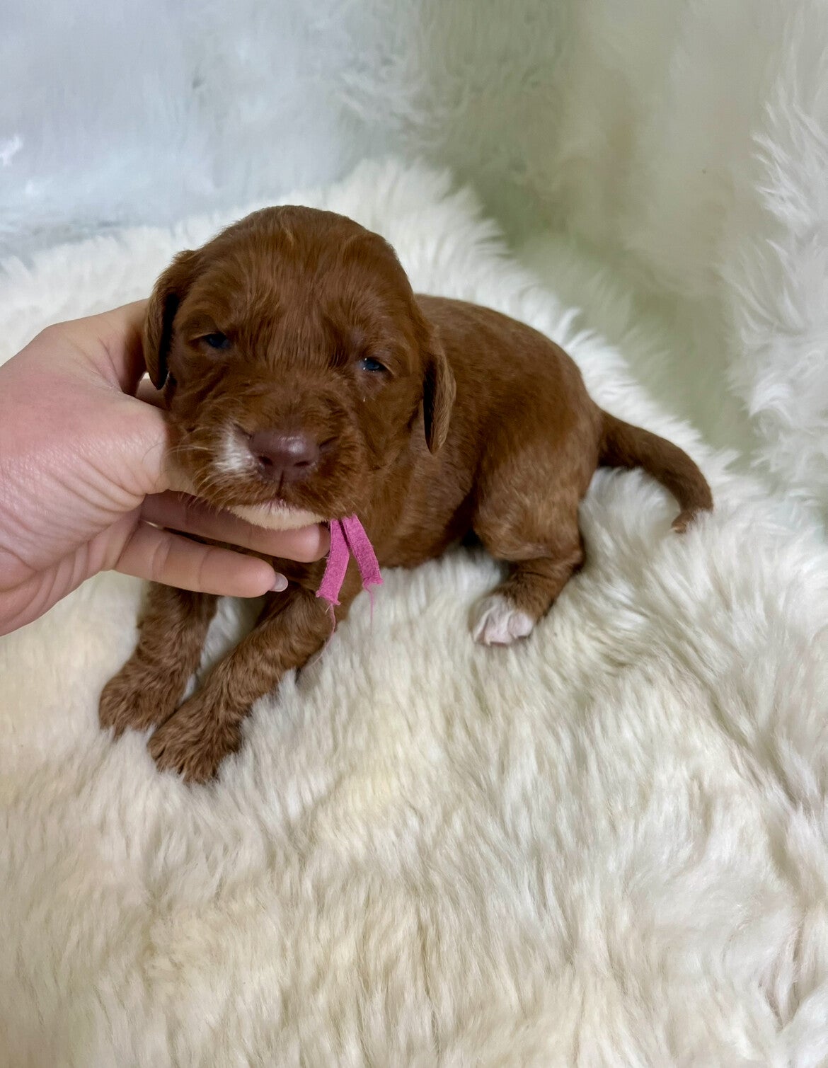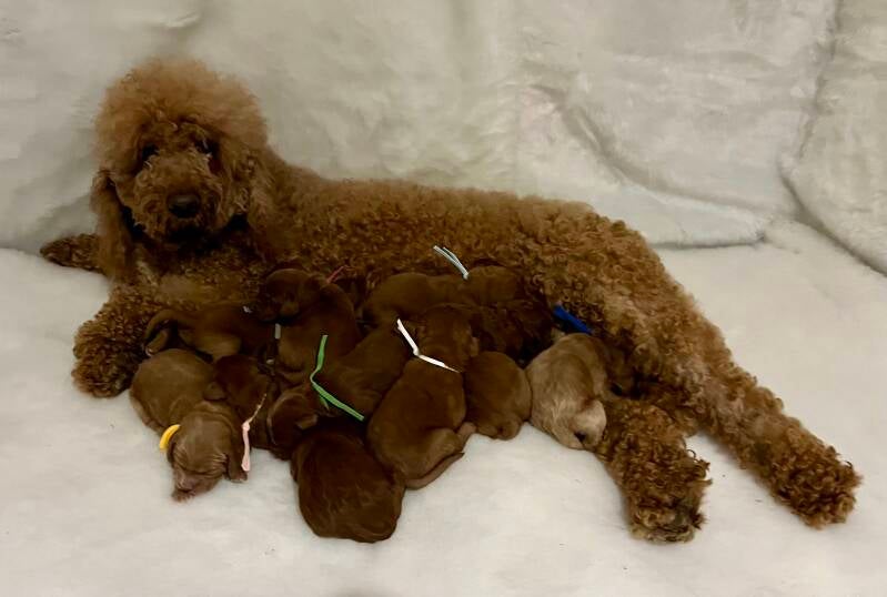 Dad is the some what famous Miniature Red irish doodle stud boy Paddington Bear ๐ป standing at 17” tall - Weighing 14kg he is renowned for his striking deep red colour that is non fading, he has a very gentle & calm nature , Amazing good looks & is total awesome in everyway, he has the most incredible coat that is super soft, fleecy and hypoallergenic (non-shedding), delightful character, confident, affectionate & super intelligent which he has proven to pass on to his offspring ... Paddington really is the full package