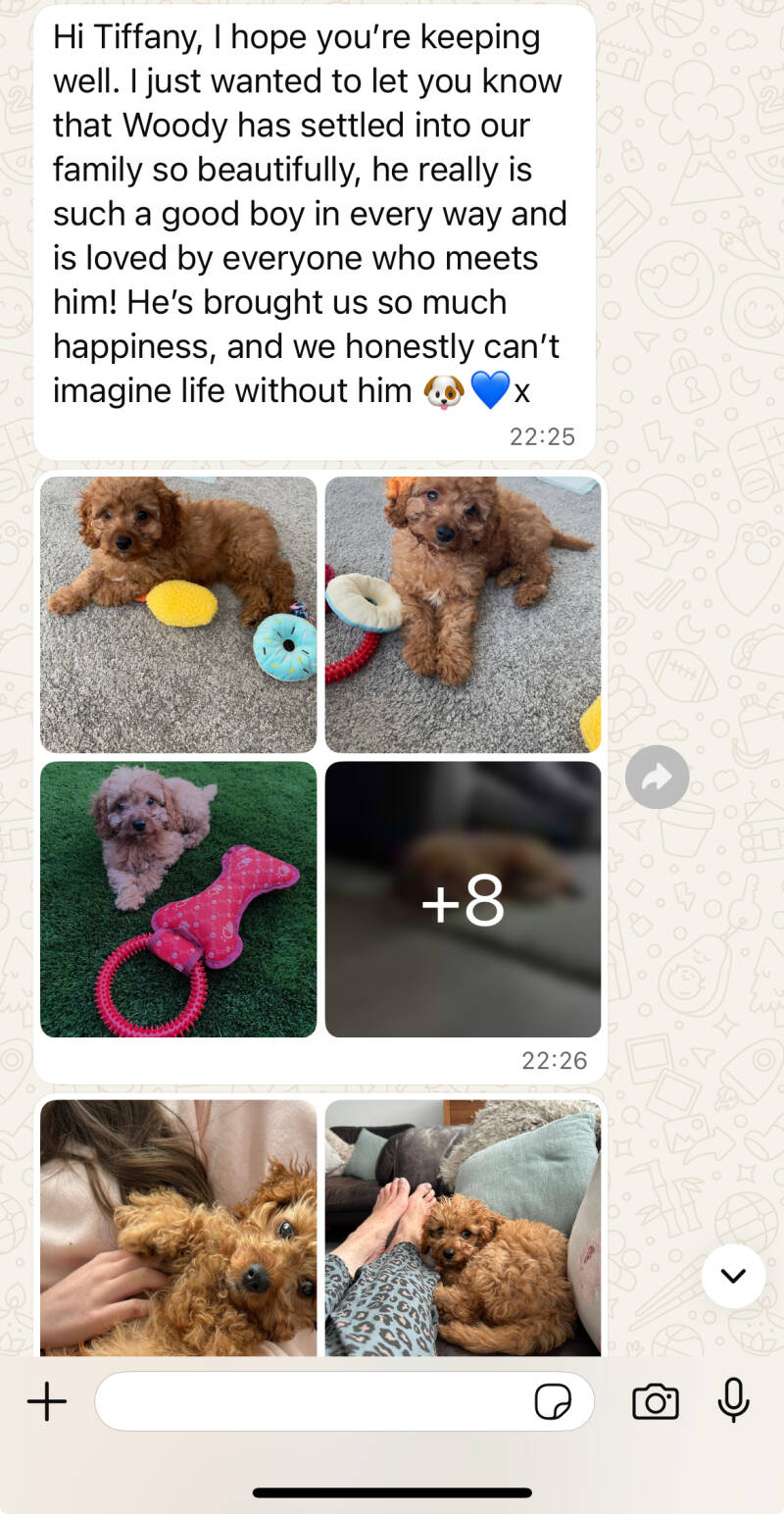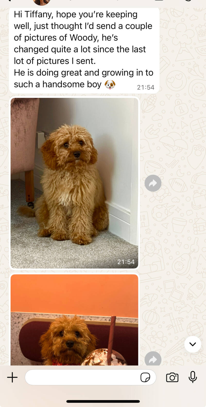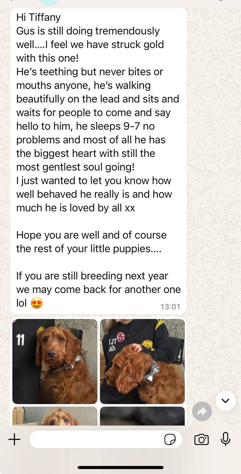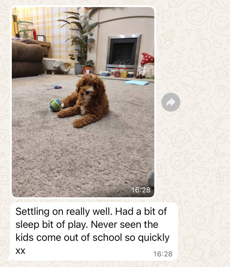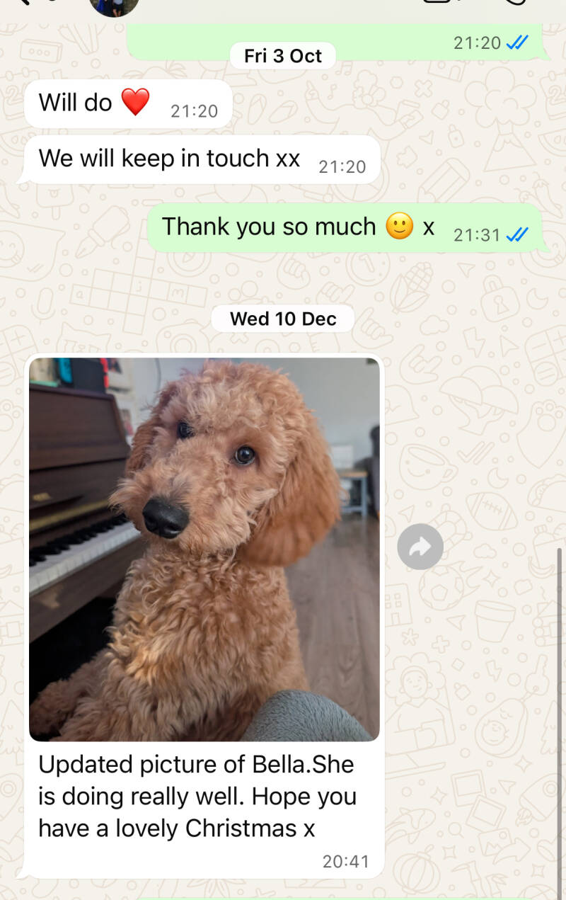 "From the very first contact, Dressedtothrill Doodles & Cavapoo's were fantastic. They answered all our questions and provided so much support. Our puppy is healthy, happy, and has settled in perfectly. Highly recommend!"